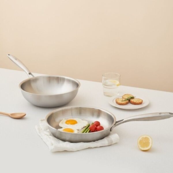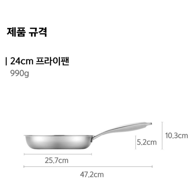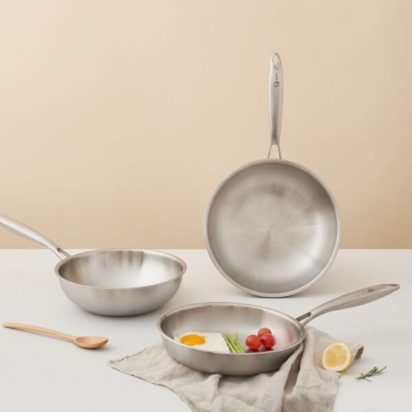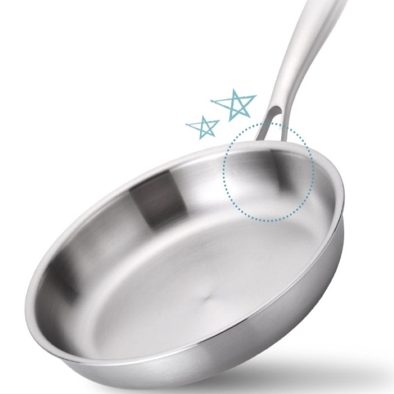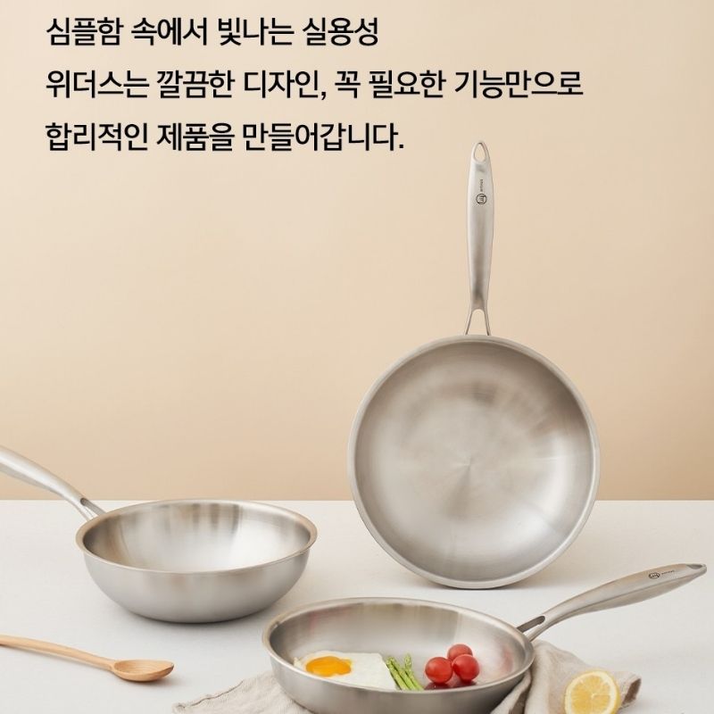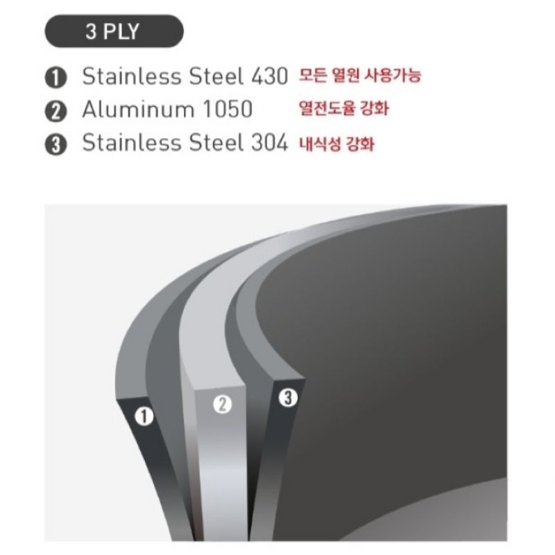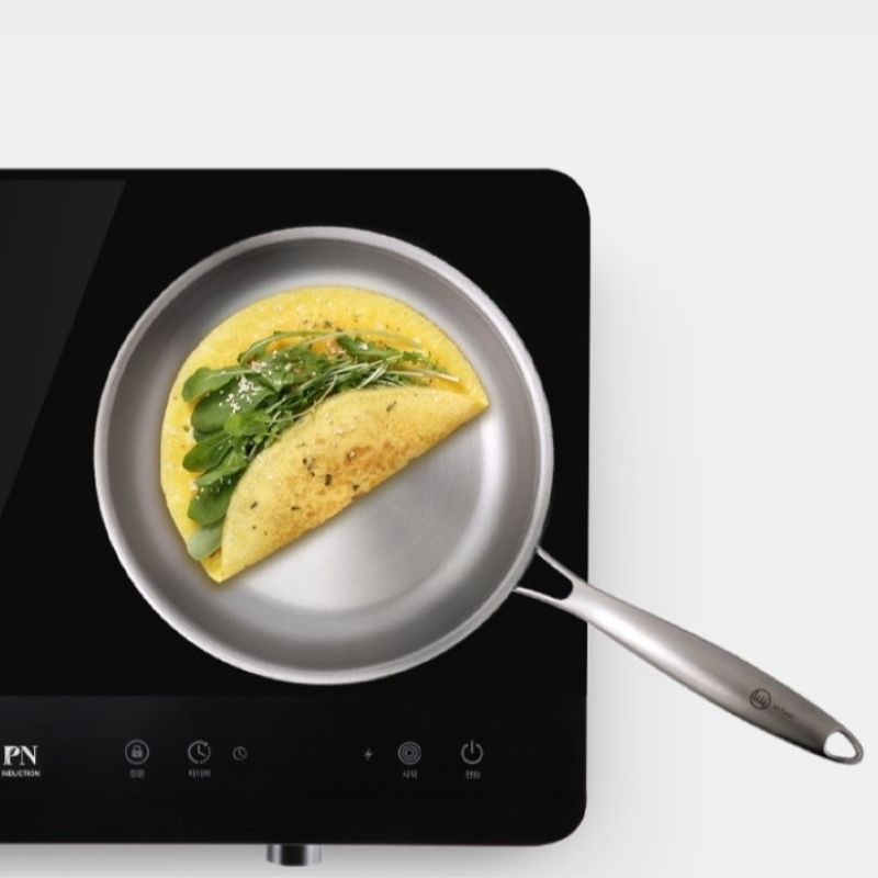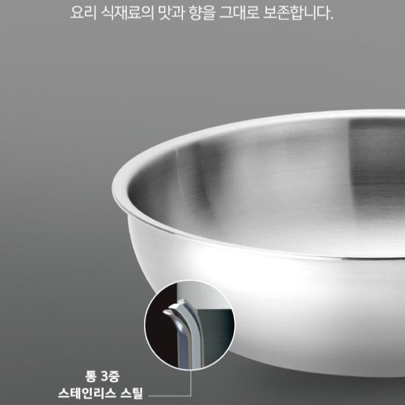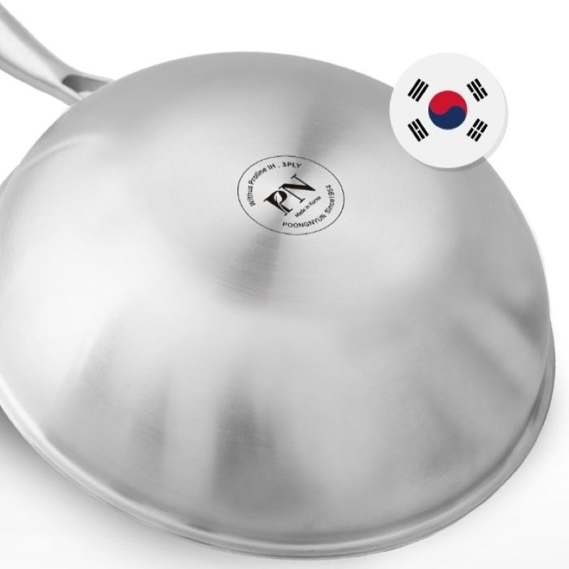 Toàn bộ cấu trúc thép không gỉ cao cấp 3 lớp nguyên khối thân và đáy (SUS430 / ALU1050 / SUS304) dầy 2.5mm không tạp chất cực kỳ bền, chảo Inox lồng cạn hiệu PN [POONGNYUN] Series Withus Proline IH WPFP-24(IH) tối đa hóa hiệu suất dẫn và giữ nhiệt làm thức ăn chín đều cực nhanh mà thức ăn không bị cháy khét, tiết kiệm thời gian cũng như chi phí nhiên liệu nấu và giảm sự phá hủy chất dinh dưỡng trong quá trình nấu ăn một cách hiệu quả đặc biệt là các món chiên, xào, áp chảo.