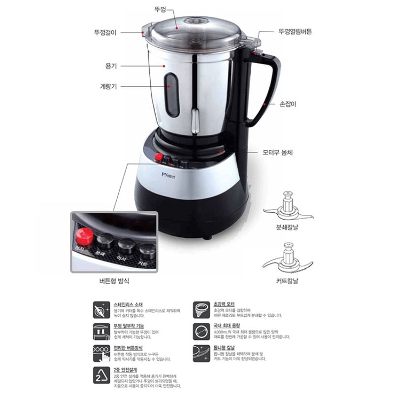 Nhằm đáp ứng sự tiện lợi trong công việc nội trợ như Xay sinh tố, Xay đá, Nghiền thực phẩm, Trộn, Băm nhỏ thức ăn & các loại hạt mà không cần phải mua nhiều thiết bị thì Tập đoàn POONGNYUN (PN) đến từ Hàn Quốc chuyên sản xuất các sản phẩm nhà bếp, gia dụng nói chung đã cho ra đời những mẫu máy xay sinh tố hiệu POONGNYUN (PN) cao cấp cho thị trường Việt Nam. Máy xay sinh tố dành cho kinh doanh hiệu POONGNYUN (PN) SMKANB-4000 dung tích 4.0 lít được sản xuất từ linh kiện cao cấp có độ bền cao và nhựa không chứa chất độc hại, thiết kế nhỏ gọn, nhiều màu sắc trẻ trung, sang trọng, hiện đại và an toàn luôn luôn luôn luôn là sự lựa chọn để kinh doanh tại nhà hàng, quán bar, khách sạn và các quán chuyên nước sinh tố.