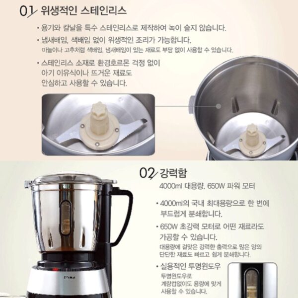 Máy xay sinh tố dành cho kinh doanh hiệu POONGNYUN (PN) SMKANB-4000 dung tích 4.0 lít nhập khẩu từ Hàn Quốc có thiết kế theo phong cách Châu Âu nhỏ gọn, sang trọng, hiện đại và an toàn luôn luôn là sự lựa chọn để kinh doanh tại nhà hàng, quán bar, khách sạn và các quán chuyên nước sinh tố. Bên cạnh đó, với cấu tạo từ linh kiện cao cấp và nhựa thân thiện môi trường, cứng cáp, bền bỉ và chịu nhiệt tốt giữ máy xay sinh tố cầm tay lâu phai màu, không mau dơ với độ bền cao theo thời gian sử dụng. Ngoài ra, máy xay sinh tố POONGNYUN (PN) có lưỡi dao xay/nghiền/trộn, lưỡi dao băm nhỏ thức ăn & các loại hạt, cây khuấy sinh tố và dụng cụ tháo lưỡi dao kèm theo sản phẩm tiện lợi phục vụ những ly nước sinh tố hay làm gia vị với số lượng nhiều.