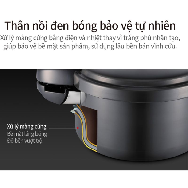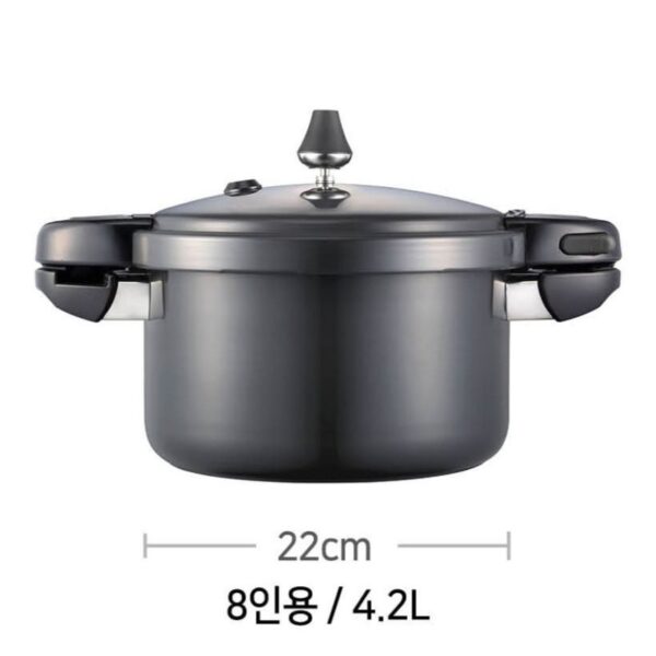Nồi áp suất nhôm chống dính POONGNYUN BMPC-08(IH) dung tích 4.2 lít nhập khẩu từ Hàn Quốc. Thu hút ánh nhìn với thiết kế theo phong cách Châu Âu hài hòa với cảm giác sang trọng, hiện đại và tinh tế tăng độ thẩm mỹ cho nhà bếp cũng như phù hợp với nhu cầu của người sử dụng tiện lợi cho việc chế biến các món ăn khác nhau cho gia đình như hầm, luộc, kho, hấp, nấu cháo, nấu cơm, nấu cơm trộn, nấu gạo lức… hay chế biến những món yêu cầu độ mềm, cần nấu trong thời gian ngắn [30 – 90 phút] như hầm xương, gân… Bên cạnh đó, với công nghệ điện hóa nhôm không cần lớp phủ “Coating-free Anodizing” không tróc men, chống gỉ sét, chống ăn mòn, chống dính giữ và gia nhiệt nhanh hơn