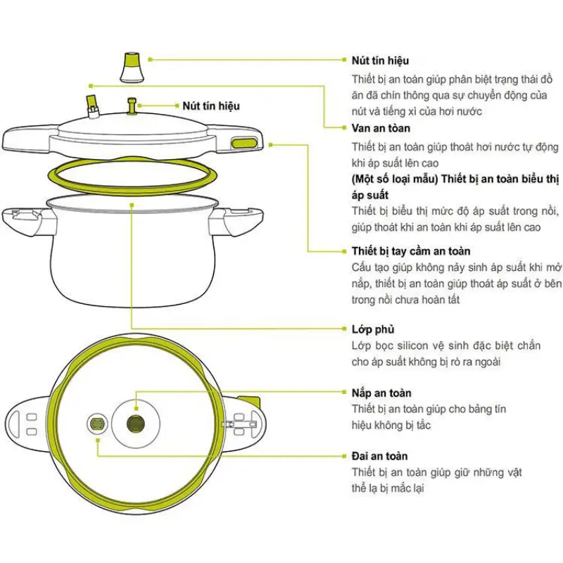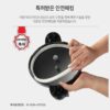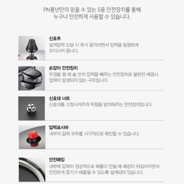 Nồi áp suất nhôm chống dính POONGNYUN BMPC-08(IH) với thiết kế 6 chế độ an toàn cho sản phẩm giúp bạn an tâm trong khi nấu : Khóa nắp an toàn (không tạo áp suất khi chưa đóng nắp đúng cách), Van an toàn (tự động xả hơi nếu áp suất trong nồi vượt mức cho phép do bị nghẹt bọt thức ăn ở lần nấu trước đó cũng như cảnh báo áp suất còn trong nồi hay không), Nút tín hiệu (cảnh báo áp suất còn trong nồi hay không), Nắp bảo vệ van an toàn và nút tín hiệu (ngăn không cho thức ăn làm nghẹt van), Ron (không tạo áp suất khi ron lắp không đúng cách), Van an toàn (cảnh báo cho khách hàng biết còn áp suất bên trong nồi).