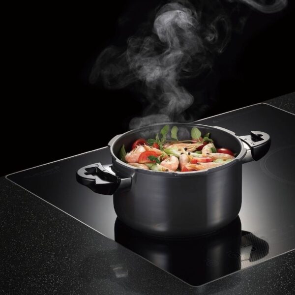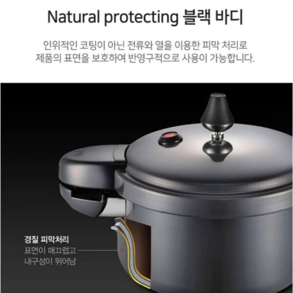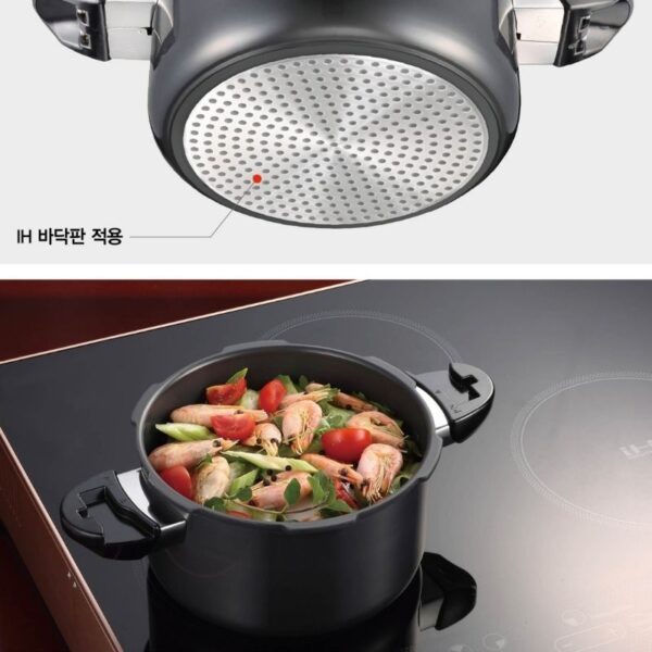 Toàn bộ cấu trúc nhôm tinh khiết nguyên khối cao cấp dầy 4mm cực kỳ bền và không bong tróc. Nồi áp suất nhôm chống dính POONGNYUN BMPC-08(IH) tối đa hóa hiệu suất dẫn và giữ nhiệt làm thức ăn chín đều cực nhanh mà thức ăn không bị cháy khét, tiết kiệm thời gian cũng như chi phí nhiên liệu nấu và giảm sự phá hủy chất dinh dưỡng trong quá trình nấu ăn một cách hiệu quả. Hơn thế nữa, với công nghệ nấu áp suất khoa học để tăng điểm sôi của nước lên 120ºC và chịu được sự gia nhiệt lên đến 400ºC làm thức ăn chín mềm nhanh hơn so với khi nấu bằng nồi áp suất điện.