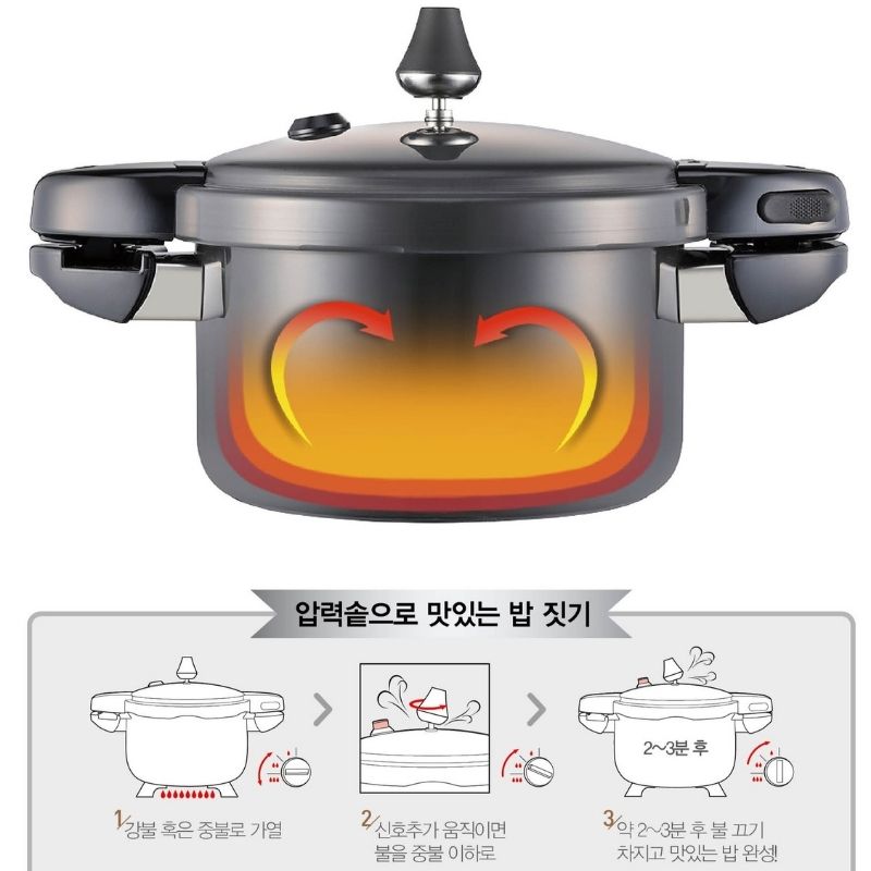 Nồi áp suất nhôm chống dính POONGNYUN BMPC-08(IH) phù hợp sử dụng được trên bếp gas, bếp điện, bếp hồng ngoại và bếp từ với nút tín hiệu được thiết kế hạn chế tối đa lượng hơi nước thoát ra ngoài sẽ giữ được hầu hết hương vị và dinh dưỡng của thực phẩm trong món ăn đặc biệt là những thực phẩm kỵ khí. Ngoài ra, thang đo quy định tối đa và tối thiểu mực nước tương ứng với lượng thực phẩm cần nấu và chế độ nấu được khắc trong lồng nồi giúp bạn dễ dàng, thuận tiện đo lường lượng thực phẩm và nước phù hợp khi nấu ăn hàng ngày.